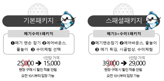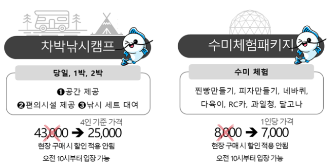 - 모든 체험 구역에는 안전요원이 상시 배치되어 있으며, 구명조끼 무료 제공.