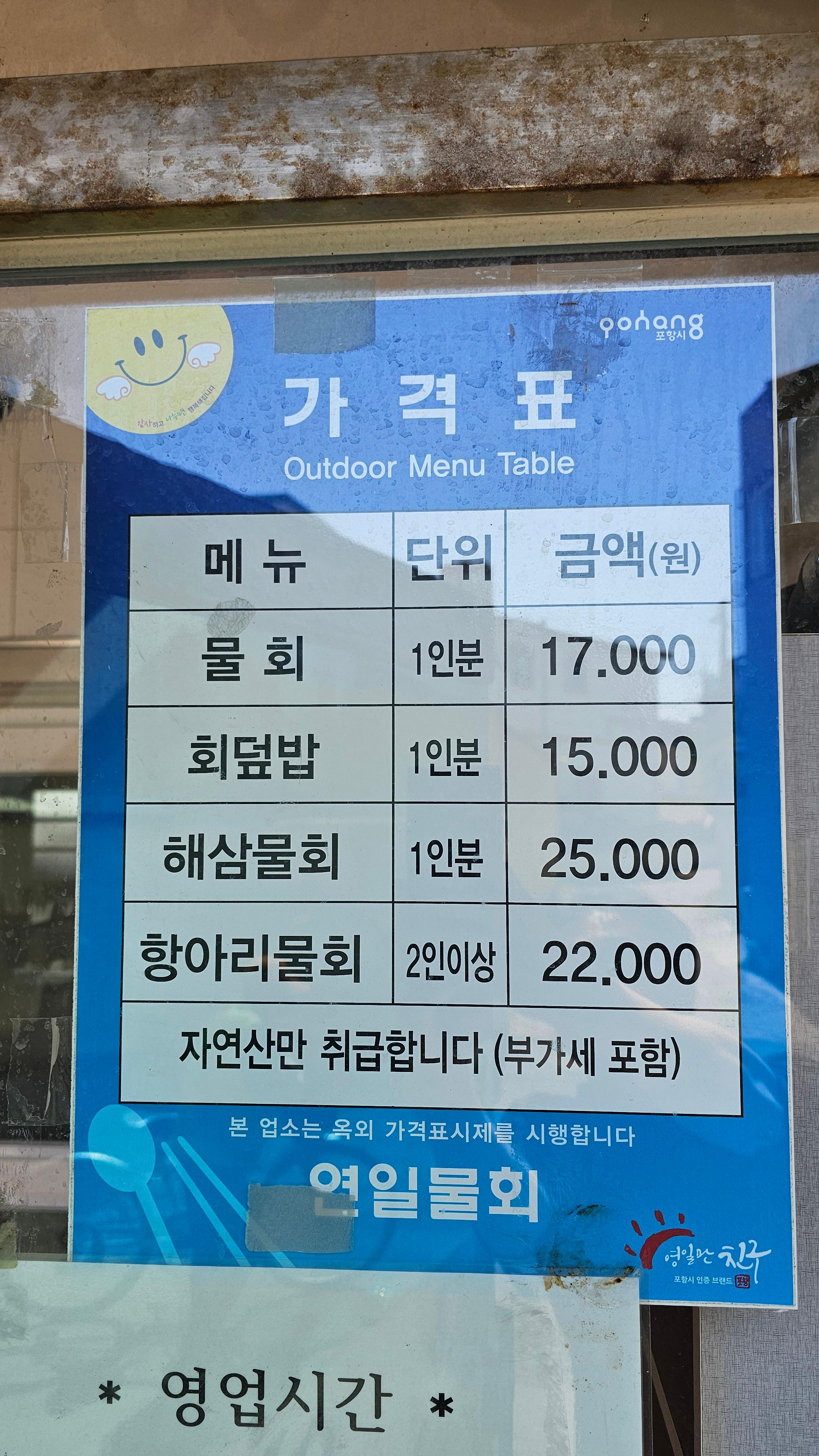 | 대표메뉴 | 연일물회 17,000원 / 회덮밥 12,000원 / 옹가지물회 20,000원 |