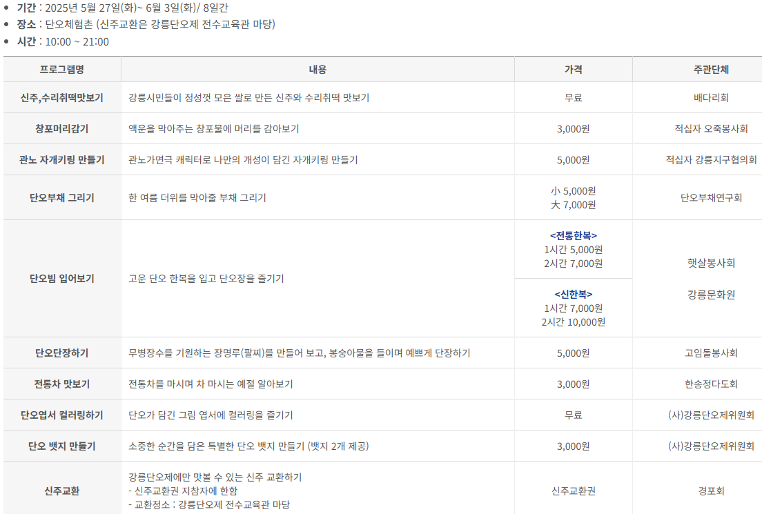 | 단옷날 입어보기 | 10:00~21:00 | 체험촌 | 신한물의 집·강릉문화원 |