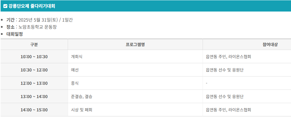 | 윷놀이 대회 | 6.1(일) | 노암초 운동장 | 강릉시 중앙동 주민자치회 |
