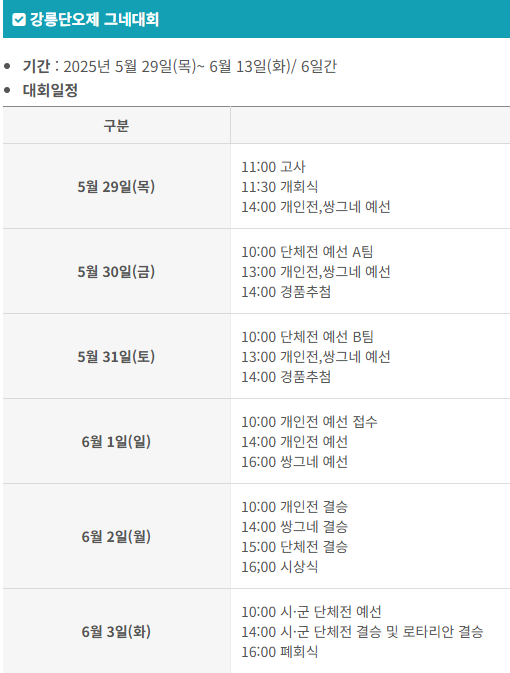 | 씨름 대회 | 5.27~6.3 | 단오장 (씨름장) | 강릉청년회의소 외 |