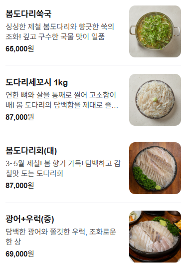 | 봄도다리쑥국 | 65,000원 | 제철 도다리 + 쑥, 깊은 국물 맛 |
