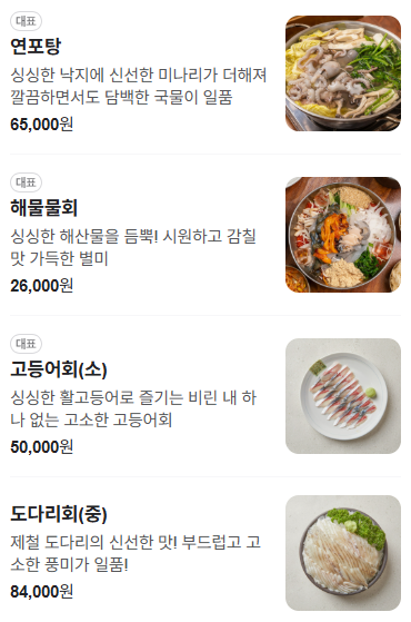 | 도다리회 (중) | 84,000원 | 제철 도다리 사용, 부드럽고 고소한 맛 |