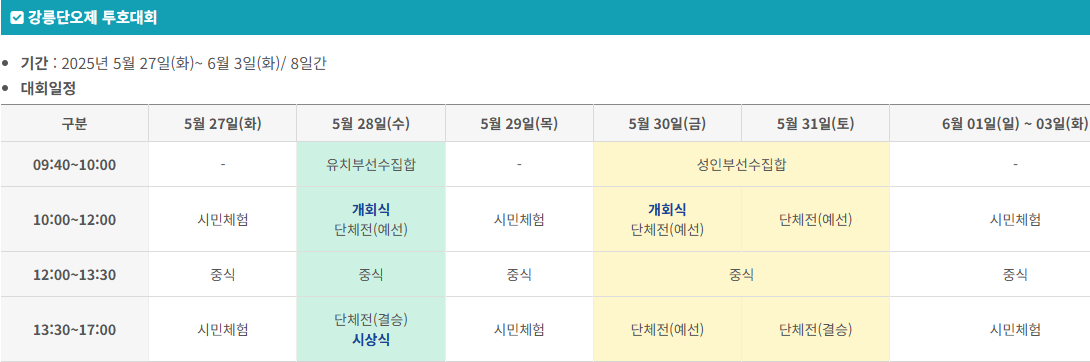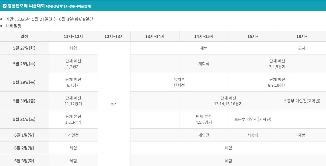 | 씨름 대회 | 5.27~6.3 | 단오장 (씨름장) | 강릉청년회의소 외 |